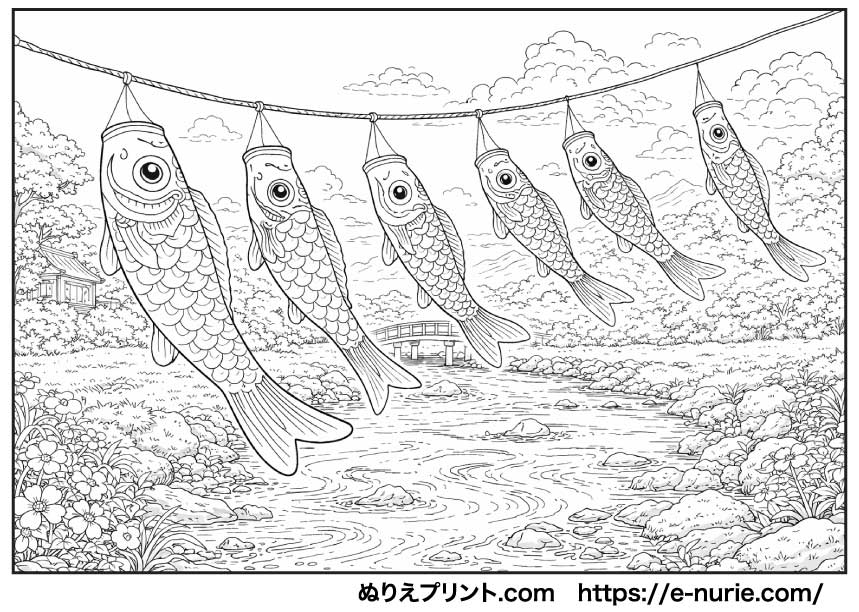 今回のぬりえプリントは【河辺の鯉のぼり】になります。