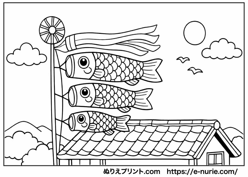 今回のぬりえプリントは【屋根の上の鯉のぼり】になります。