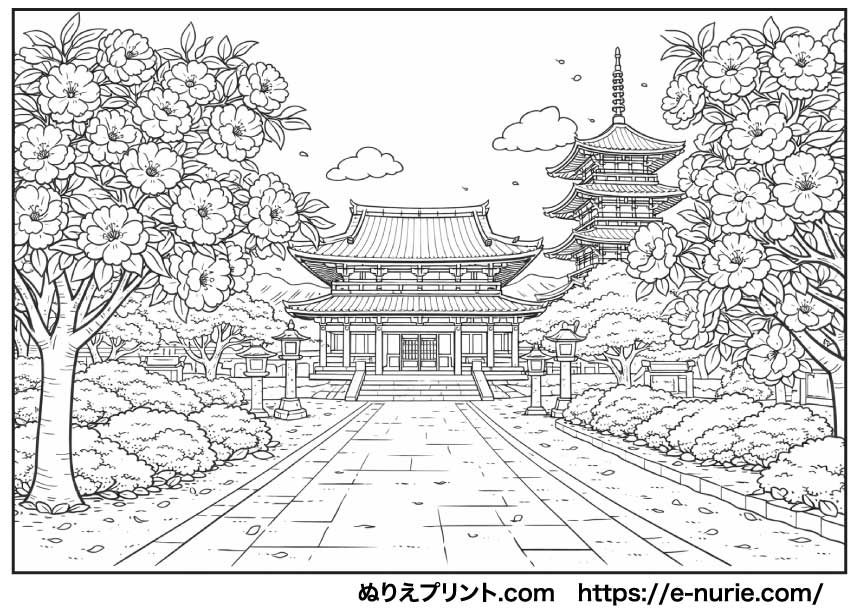 ぬりえプリント【お寺の八重桜】