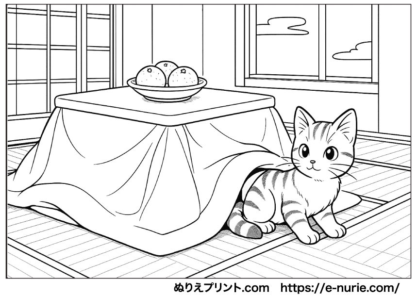 今回のぬりえプリントは【こたつと猫とみかん】になります。